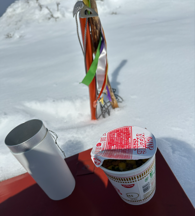 頂上ではいつものホットコーヒーと、カップヌードルを食して下山に向けた体力回復を行う。