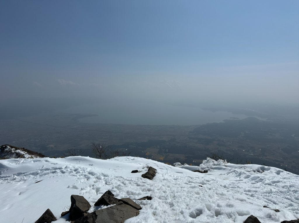 ゲレンデをてくてく登るのだが、振り返るとそこには猪苗代湖が。