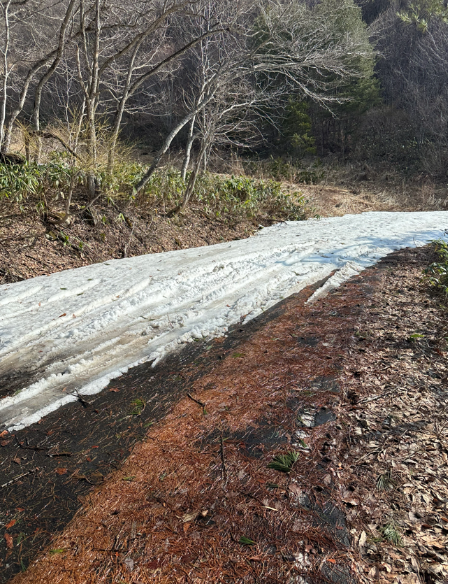 さて、登山口への道の途中、どうしても超えられない残雪の塊があった。
