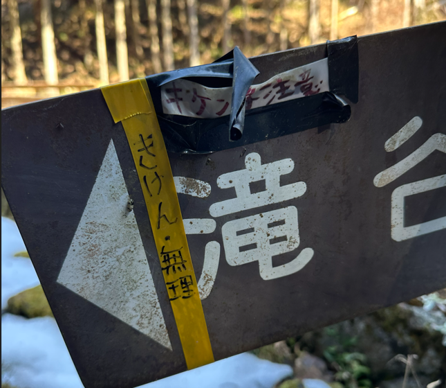 登山口の道標、滝谷峠への道標には「きけん、無理」誰かがしたためた跡が。