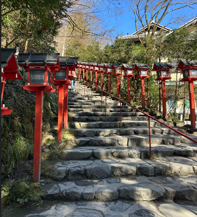 貴船神社に到着、赤い灯篭が連なり映える風景。